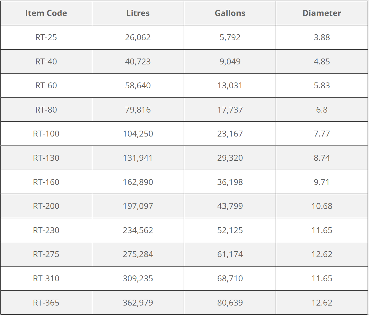 RT-365: 362,979 litres – 12.62 m diameter (with optional 2.9 m wall height for added volume)