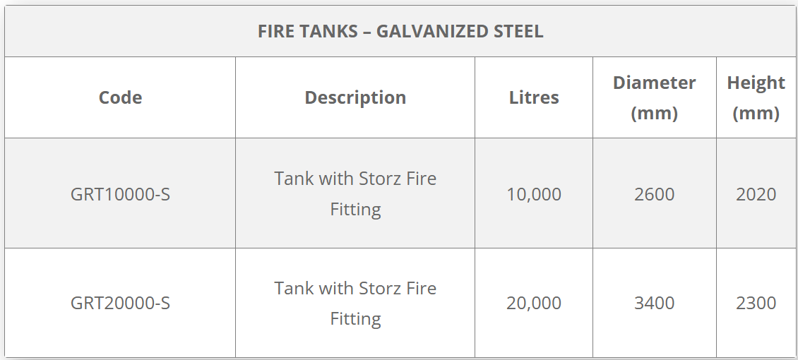 Fire-rated steel tanks with Storz fittings, compliant with emergency services at 10,000 L and 20,000 L capacity